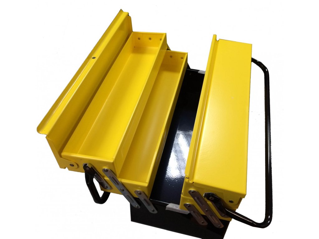 Kovové panty umožňují otevření do šířky pro snadný přístup k nářadí ve všech částech boxu najednou